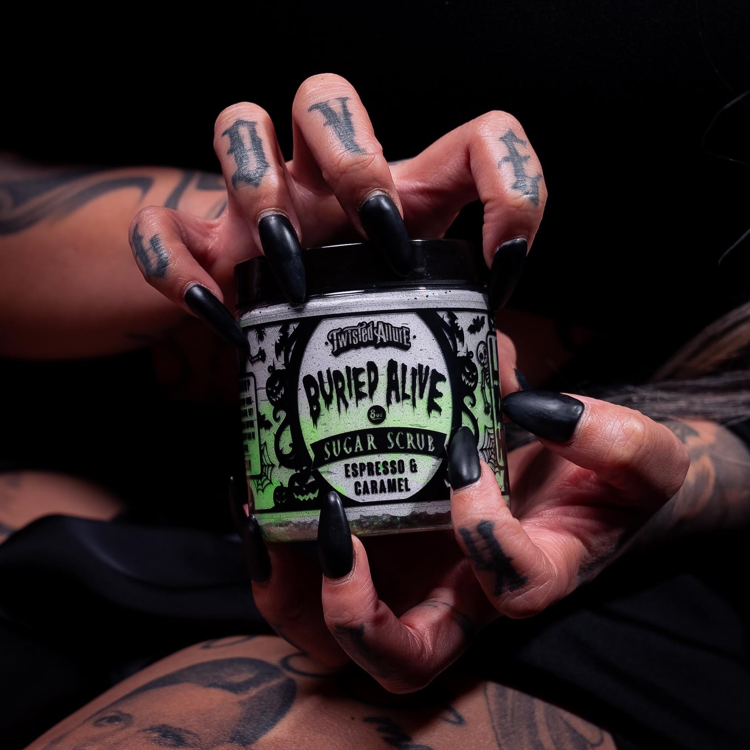 Grey and green scrub packed with rich espresso and gooey caramel—like a zombie’s morning pick-me-up. Topped with a bloody hand clawing its way back for one more lather.