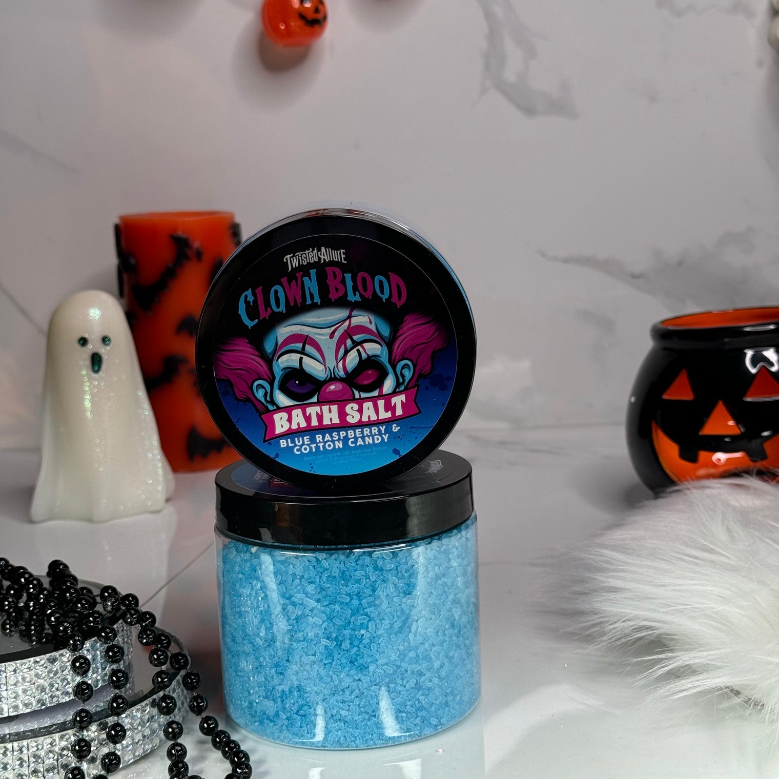 Step right up if you dare. Clown Blood turns your bath an eerie electric blue with the wickedly sweet scent of blue raspberry spun sugar. A carnival of chaos in every jar.