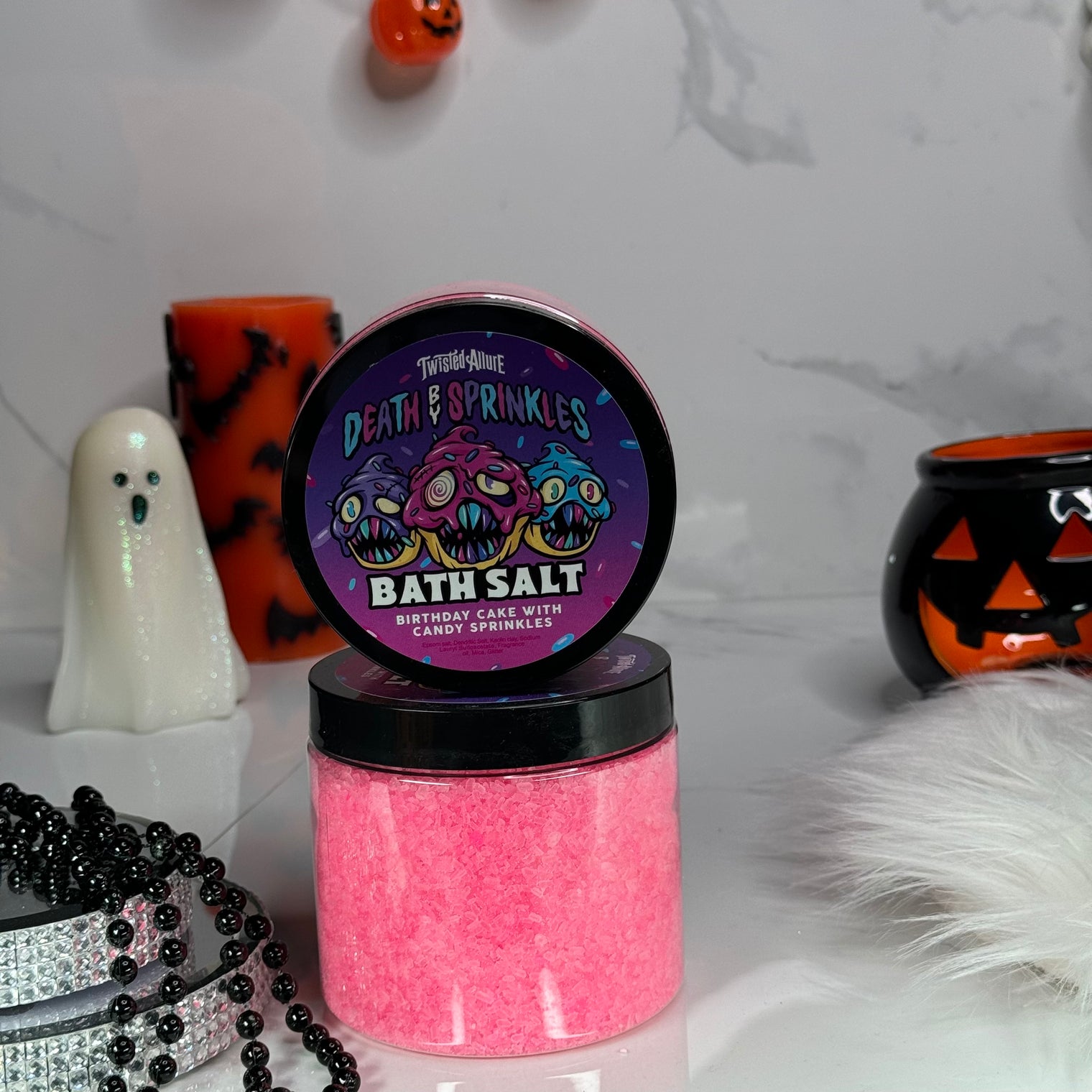 Rest in sprinkles. This sweetly sinister soak smells just like birthday cake with a sugary sprinkle twist. The neon pink bathwater makes every dip a deadly party for one.